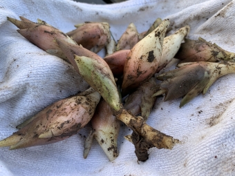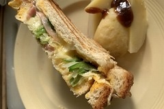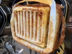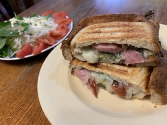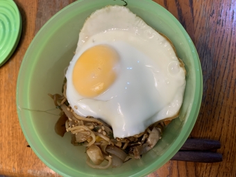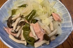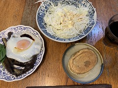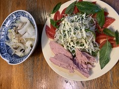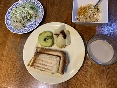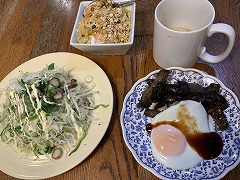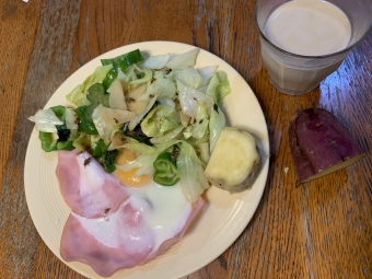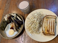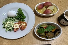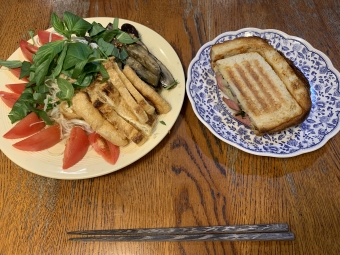 I had stir-fried vegetables, ham and eggs, baked sweet potato, and cafe au lait for my breakfast. I mowed the lawn with a Karibaraiki. The area of my lawn in the vacant lot owned by my wife is increasing every year, so it's becoming a lot of work every year and year. It got really hot around 10 o'clock. I was halfway through, but I stopped. I harvested some myogas. I made hot sandwiches with myoga, onion, basil, sausage, and cheese for my lunch. I made a salad with tomatoes, basil, aburaage, cabbage, and green peppers for my evening meal. I also had a hot sandwich that is leftover from my lunch. |