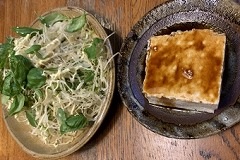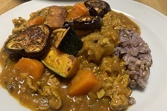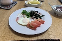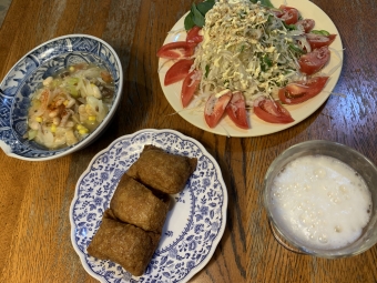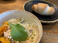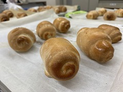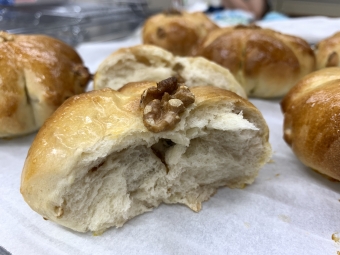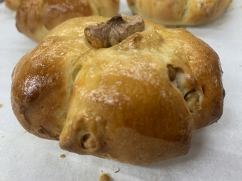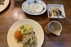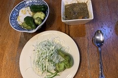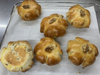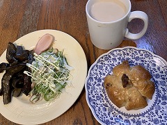 I got up early and cleaned up the lawn I had mowed the previous day. I finished work at 7 o'clock. I had the leftover the sauce yakisoba, served with a fried egg and cafe au lait for my breakfast. I participated in a bread-making class at Sarushima Community Center from 9:00. Today's assignment was to make Kurumipan. I mixed walnuts into the dough, shaped it into a flower shape, placed one walnut in the center, and baked it. It went well. It was delicious. Anyway, all the freshly baked bread is delicious. I had vegetable and soybean soup, sliced tomatoes, grilled eggplant, shredded cabbage and bell pepper salad for my evening meal. The soup was prepared and kept cold. |