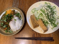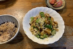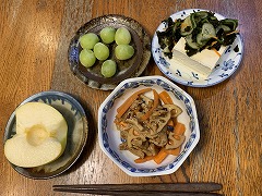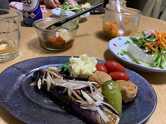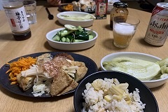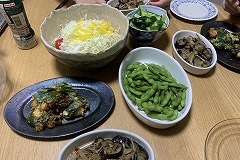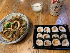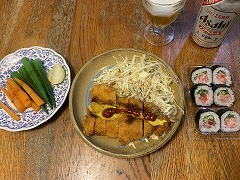 It's hot even though it's September. I made chilled curry somen noodles for my breakfast. I opened the windows in the other rooms to let the breeze in. I was editing photos in an air-conditioned room. Around 4 p.m., I was wearing headphones, but I heard a noise so I left the room and found a gust of wind blowing through my house. The photo frames fell and books were being blown away. I closed all the windows in the house. Warm and cold winds blew alternately. There were low dark clouds up and to the east. I looked around for a while, wondering if a tornado was forming. Eventually, the wind died down and cold rain began to fall. I thought it was a downburst or something. According to the news, Tsukuba City and Sakai Town suffered major damage at the time. Today was Thursday, Torisen's senior discount day. I bought groceries. I had pre-made fried horse mackerel and sushi rolls for my evening meal. I also had grilled carrots and okra, and non-alcoholic beer. |