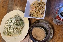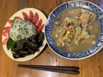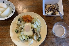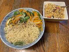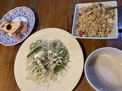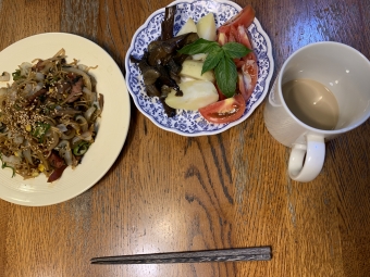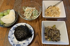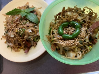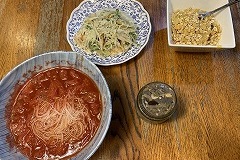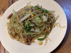 I made two servings of Sauce Yakisoba. One was for my breakfast and the other for my lunch. II also had sliced tomatoes, grilled potatoes, basil, stir-fried eggplant with miso, and cafe au lait. I mowed the lawn with a Karibaraiki. I continued working from yesterday. It was very humid. I finished around 9:30. I had Ten Seiro soba at my favorite Tsukuba soba restaurant Kimura for my lunch. So, the yakisoba I made the morning was left over. Miya-O met with her doctor. He ran a blood test on her. The results were not significantly different from the previous test, so we decided to wait and see for three months.The next appointment is in three months. I made a soup with several kinds of vegetables and soy milk for my evening meal. I also had a salad of shredded cabbage, sliced tomatoes, and basil, and inari sushi that I bought at Torisen. So, the yakisoba I made the morning was left over. |