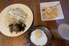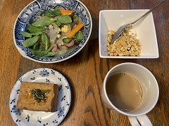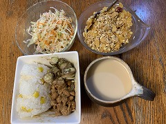 It was been a while since I last cooked rice. Freshly cooked rice is delicious. I had it with natto for my breakfast. I also had salad, granola yogurt, and cafe au lait. While I was writing my diary, a cat came and disturbed me. That's a normal thing that happens in my house. |