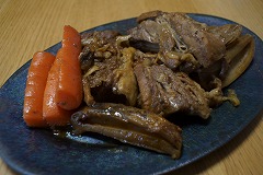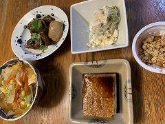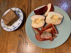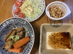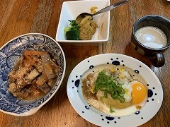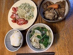 I made vegetable and vermicelli soup with mochi, lettuce and cherry tomato salad, granola yogurt, and cafe au lait for my breakfast. I bought some discounted pork ribs at Torisen to prevent them from going unsold. I made a soy sauce stew of pork ribs and carrots and lotus root. Today is the anniversary of my mother Tomiko's death, so I went to visit my family grave. However, the wind was so strong that I couldn't light incense. There was a risk of fire, so I decided not to light incense. I baked graham bread in my automatic electric bread maker and it didn't rise as well as it used to. I baked graham bread in my automatic electric bread maker, but it didn't rise as well as before. My wife says that domestic wheat flour doesn't rise as well as imported wheat. Indeed, this time I used flour from wheat grown nearby. It doesn't rise as well, but the aroma and sweetness are wonderful. I had pork ribs, lotus root and carrot stew, tofu, cabbage and tomato salad, and natto for my evening meal. |