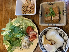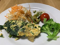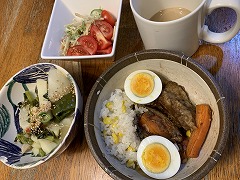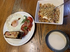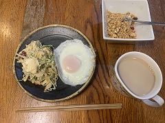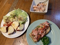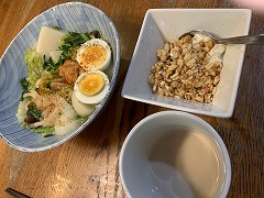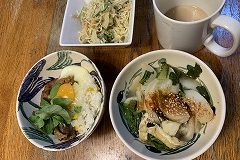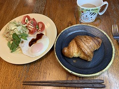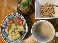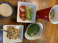 I had salad, a fried egg, a croissant, and cafe au lait for my breakfast. For my lunch, I had cherry tomato cheese toast topped with basil leaves and cafe au lait. The table was became tidy. I think this is a limited, short-term phenomenon. I went to Torisen to buy milk. I also bought some Sukeroku sushi, which was half price to reduce food waste. I had vegetable soup, cabbage and tomato salad, natto, granola yogurt, and Sukeroku for my evening meal. |