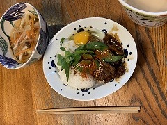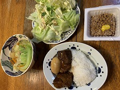 Miya-O likes to watch the cars driving by from her balcony. It must be freezing there in the morning, but she stays there for about 20 minutes. Then she goes back to her room and stays warm. I made tofu and vegetables soup for my breakfast. In the morning, I also made braised pork belly and pork curry, which is divided into 150g portions and froze. I had curry rice and salad for my evening meal. |