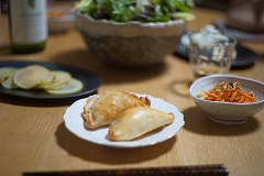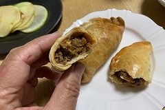 I had cafe au lait, and oden fish paste and vegetable soup that is leftover from last night for my breakfast. At 1:30pm I left for Ueda with my cat. The expressway was congested because there had been an accident near Tsurugashima Junction. I exited the Ken-O Expressway at Sakado Interchange and entered the Kan-Etsu Expressway at Tsurugashima Interchange. I drove along a narrow, unfamiliar road relying solely on the navigation system. I wouldn't have attempted such an adventure if it had been dark. There's no way to know if the arrival time has been shortened, so the only thing left was a little adventure fun. I arrived at Ueda my son's house at 5:30. I had some Empanadas that my wife made for my evening meal. Empanadas are a dish that was introduced to South America from Spain and are especially popular in Argentina, Chile, Colombia. My wife seems to have modeled her recipe after Argentine empanadas. |