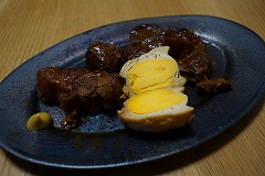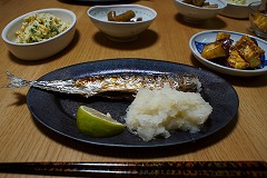 My wife cooked some dishes for our breakfast. It was raining a little today. I took some photos while walking around the neighborhood. I tested the PETRI lens C.C.Auto Petri 1:3.5 f=28mm No.132878. Despite the rain, there were more tourists than usual at the castle ruins park. Perhaps it was because of the Autumn Leaves Festival. My wife grilled saury for our evening meal. I also added some braised pork belly and braised pork belly that I made. |