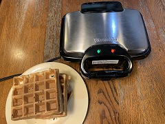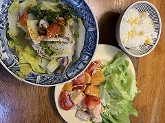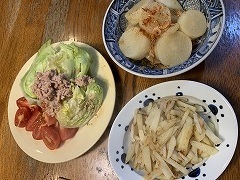 The expiration date of my tempura flour is approaching, so I baked waffles. To me, it's easier than tempura. The texture is a little different, but it's tolerable. I made stir-fried shredded potatoes, stewed small shrimps and radish, and a lettuce, tomato, and tuna salad for my evening meal. |