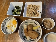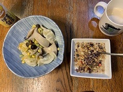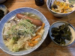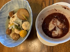 My wife made our breakfast. My wife has been making several kinds of New Year's dishes since the morning. Anko, kinpira, and namasu were already ready. We had them for lunch. My wife also made oshiruko ( anko soup with mochi). I made a vegetable and sausage soup for our evening meal. |