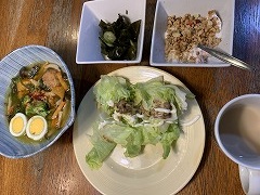 I had lettuce, boiled eggs, vegetable soup, atsuage, granola yogurt, the fish fry burger that I bought at Torisen, and cafe au lait for my breakfast. I made kakiage soba for my lunch. The soba is Togakushi soba, but it's dried. The kakiage was bought at Torisen yesterday. I remembered that there was a large ginkgo tree in front of the bell tower of Saiko-in Temple. The ginkgo tree and the bell tower would be photogenic. I went to see it. Most of the ginkgo leaves had fallen.Next year, I'll try to find a good timing. My wife was coming back from Ueda, so I went to Shimizu Park Station to pick her up. After that, we went to Coppun Cafe in Moriya and had Thai curry. |
