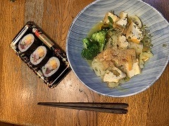 My wife made our breakfast. She went to her favorite hair salon in Iwai. I received GODIVA as a year-end gift. I'm so happy. Chocolate prices have gone up a lot, so I don't buy much myself. I cooked our lunch when she got home in time from the hair salon. It was vegetable soup and clam rice. We had chicken ramen with lots of vegetables for our evening meal. |