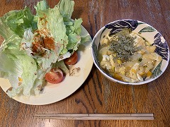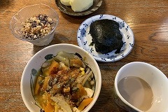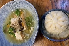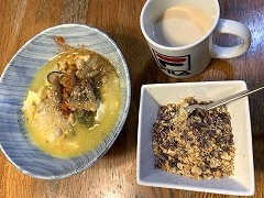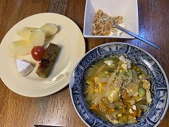 It was raining. I went to take a photo of the nearby Kannon stone statue. The image I got was different from what I would have gotten on a sunny day. I made tomato vegetable soup for my breakfast. Adding tomatoes changes the soup from vegetable soup to tomato soup. The taste changes dramatically. I also had a fried egg, lettuce, wakame seaweed, and cucumber salad, grilled atsuage, and cacao nib yogurt, and cafe au lait. I went to Costco and bought potatoes, onions, green peppers, eringi mushrooms, shimeji mushrooms, dried shiitake mushrooms, sausages, and Greek yogurt. I had temseiro soba at my favorite soba restaurant Kimura for my lunch. I had two kinds of mushroom and vegetable soup and two kinds of grilled mushrooms for my evening meal. |