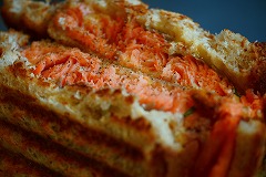 It is thinly sliced pork belly and mixed together with grated potatoes, then I grilled it. I called it Butabara burger. I made a hot sandwich with grilled shrimp, cabbage and mayonnaise on toast. |