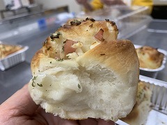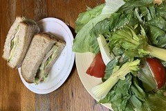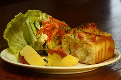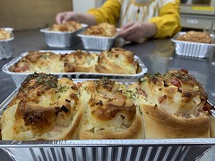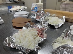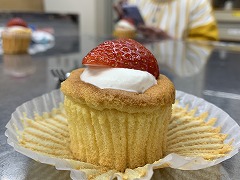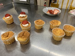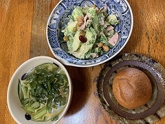 I participated in the final bread-making class at Sarushima Community Center from 9:00 a.m. Today's assignment was to make onion bread, which involves wrapping chopped onions and bacon in dough and baking it. Everyone understood the procedures and got used to the work, so we finished 30 minutes earlier than planned. The instructor Natsumi Nakajima sensei made chiffon cupcakes for everyone decorated with strawberries and whipped cream. They were delicious. The onion bread was also delicious. I'm glad I took this class because I got a good understanding of the bread-making process. I had self made onion bread, apple, cabbage lettuce and carrots salad, and cafe au lait for my evening meal. |