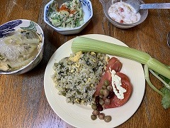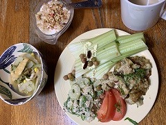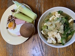 I had dumplings and vegetable soup, sliced tomatoes, fried eggs, homemade round bread, and cafe au lait for my breakfast. My younger brother gave me a whole of celery. I made a salad with potatoes, ham, celery, and boiled beans for my lunch. I also made celery salad. I made celery and tofu soup for my evening meal, and of course I munched on two stalks of raw celery. |