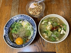 I'm sleepy because I've been getting up early for the past few days. I can't get up early. But this morning, Miya-O woke me up. She was hungry and couldn't wait. I made tofu and sausage soup, granola yogurt, and cafe au lait for my breakfast. I had zoni and cafe au lait for my lunch. I had curry rice, grilled atsuage, apples, and tomatoes for my evening meal. |