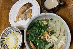 I had vegetable soup, anko mochi, and cafe au lait for my breakfast. I went to Ishikawa Eye Clinic for my regular checkup. Previous checkups had not shown any functional decline. However, a medical examination and test showed a slight decline in the function of my right eye. My doctor prescribed eye drops. I made grilled chicken for my evening meal. |