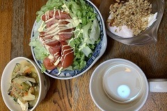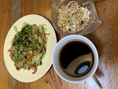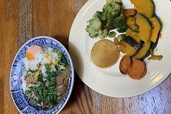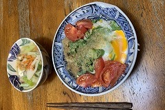 I had vegetable soup, a fried egg, lettuce, sweet potato, granola yogurt, and café au lait for my breakfast. I went to Chikusei City to attend the monthly meeting of the Photo Kano Club. Today, Mr. Kamakura was absent, so it was just Mr. Tokunou and me at the meeting. I had seiro soba at my favorite soba restaurant Kimura. The soba noodles from Kimura and Katanaya are quite similar. It's a shame I can't compare them side-by-side. On my way home from a soba restaurant, I discovered a stone Buddha stupa by the roadside in Takasuka, Tsukuba City. Due to erosion from wind and rain, its shape is unclear, and the inscription is illegible. I searched around for a suitable location to take photos of the full moon and cherry blossoms in full bloom. I made a salad with lettuce, tomatoes, and burdock root. I also made vegetable soup and cucumber in vinegar for my evening meal. |