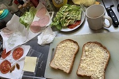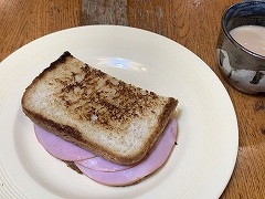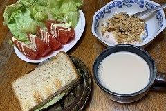 I had a rice bowl with braised pork spare ribs, boiled spinach and a raw egg for my breakfast. I also had sliced tomatoes, vegetable soup and cafe au lait.. I made a hot sandwich with ham, cheese, cucumber and Nara zuke. As usual, I left it on the kitchen windowsill to dry. I had hot sandwiches, boiled spinach, grilled Atsuage, and vegetable Harusame soup for my evening meal. The potted arugula has bloomed. Spring will soon be here. |