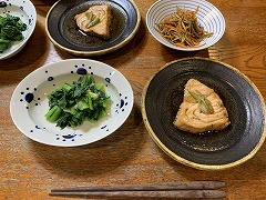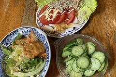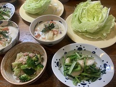 For our breakfast, I made a cream stew with potatoes and vegetables and a lettuce salad. My wife made a bok choy and tuna salad and stir-fried turnips. My wife and I went to Amidaji for Higan-mairi. My family's grave is there. My wife bought groceries at Torisen and cooked our evening meal. |