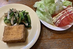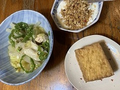 I added a raw egg to the leftover sauce yakisoba from yesterday, heated it up, and ate it for my breakfast. I also had granola yogurt, sliced tomatoes, coleslaw salad, café au lait. I made grilled atsuage, fried rice with pickled mustard greens , and coleslaw salad for my evening meal. Several flowers have bloomed on the potted arugula plant. I picked the flowers and placed them on top of the atsuage, and it looked a little prettier photogenic. So, I set up some lights and took pictures of atsage. |