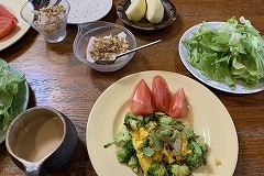 My wife made omelets, salad, granola yogurt, and café au lait for our breakfast. My son went to work as usual. My wife and I drove along the Nagano Expressway to the Yachiho Kogen Interchange. There's a roadside station nearby called Yachiho Kogen. We gathered information about tourist spots in central Nagano Prefecture at the visitor center. We got several free leaflets. There was a Montbell Sakuho store inside the same roadside station. My wife bought a daypack. We had soba noodles at a restaurant here. My wife made stir-fried lotus root and beef with tomatoes for our evening meal. |