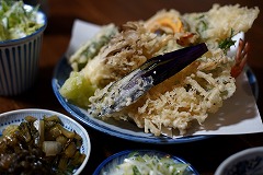I made a soup with pumpkin, vegetables, and soba for my breakfast. I went to visit my cousin who is battling an illness. I had been a while since I'd seen him. Shuroku is next to Torisen. This former sake brewery has now been renovated into a complex that includes a multipurpose hall and a cultural, historical, and tourist information center. I'd never really looked inside before, so I decided to explore. There was a glassblowing workshop. Craftsman was working. A sake brewery had been converted into a hall. There was a group doing jazz dance. I took a few photos. The structure of the sake brewery could be used as a background for something. Next time, I'll try bringing a subject to photograph. I had squid tempura, kakiage, and norimaki sushi that I bought at Torisen for my evening meal. |