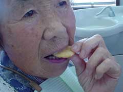 ![]() Kさんのあたらしい義歯に金色銀色の金属冠が入ってます。義歯に入れる前歯の金属冠は装飾品と考えて良いでしょう。旧義歯から冠を移植しました。以前の義歯から金属冠を移植すると口元の印象が以前と同じになります。(左写真) 新しい義歯に早く慣れるにはいくつかのコツがあります。スタッフがそのコツをKさんにお話しているところ。(右写真) 最後にテストフード(センベイ)を試食していただいて今日の診療を終わりにします。 |