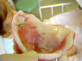 ![]() ![]() ![]() 木根淵病院に骨折して入院中のKさんのところへ訪問歯科診療をした。(左写真)右上顎第二大臼歯の歯根の欠片が残っている状態なので本来抜歯してから義歯を製作するところであるが、入院中では抜歯を実施できないので歯根をのこしたまま上顎義歯を修理しテシュコンデショナーを施した。(中写真)義歯が安定したらしい。ゼリー菓子を試しに食べてもらい義歯が安定したことを確認した。来週は下顎の義歯を修理する予定だ。上下義歯が安定してよくかめるようになったらそれを利用して新しく製作する義歯の印象をする。機能的な義歯を作るためには手間がかかる。。 |