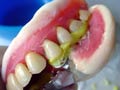 I さんの義歯が破損してしまった。義歯の中にシート状のネームプレートを埋め込んである。義歯に名前が入っているのだが、強度が少し落ちるのは否めない。義歯の磨耗によりネームプレートが義歯表面に露出してしまいました。ここに応力が集中して義歯が破断したと思われます。また、この義歯は平成14年に作られたもので、その後3回補修と修理がされています。製作してから5年経過しているので樹脂材料が劣化してしなやかさが失われ強度が落ちています。義歯を新しく製作する必要があります。今日は応急的に義歯を修理しました。 |