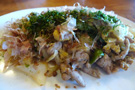 きょうのばんめしは、黒胡麻たれのバンバンジー、キャベツとピーマンのカレー炒め、トマト、焼きたてパン。(右側下段写真)