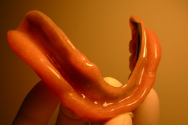 ![]() 今日は、老健きねぶちさんに訪問歯科診療をする。Kさんの新しい義歯を作るための形を採る。Kさんの現在使用中の義歯にテッシュコンデショナーが施されている。こうすることで義歯に使用中の力が掛かった状態の口腔粘膜の形が採れるのだ。これを機能印象という。(左側写真) 義歯の内面に石膏を流して固め作業模型を作る。(上段中写真) 内面に石膏を流した義歯を咬合器(下顎の動きをシュミレーションする装置)に装着する。この作業を咬合器装着(マウント)と言っている。上下義歯を患者さんの口の中と同じかみ合わせ状態で咬合器に装着する。(下段中写真) 石膏模型から義歯をはずすと咬合器の上に、患者さんの上下顎の模型が形と位置関係を再現される。この咬合器上で新しい総義歯を作るのだ。 |