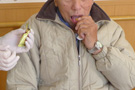 ![]() 木根淵病院に入院している患者さんの義歯修理をおこなう。ベッドサイドで義歯を削って調整する。 |