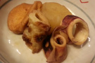 日曜日なんだけど早起きした。冷蔵庫に冷凍されているかあちゃんが作ったパイ生地を発見。解凍して「ソーセージのパイ包み」を3個つくった。ソーセージは出来合いのウインナーソーセージです。パイ生地でソーセージを包み整形します。表面に卵黄を塗ってオーブンで200度20分焼いてみた。色も形も膨らみ具合も良い感じにできました。その中でもこれが一番です。(左側上段写真) 朝ごはんは、昨夜のスープをベースに餅と油揚げをいれて雑煮にしてみました。(左側下段写真)。 ひるご飯は、ソース焼きそば、具は豚肉にんじんとキャベツ。 がんもどきと大根の煮物つき。がんもはわりと味が染みにくいな。。 ばんごはんは、かあちゃんの実家でそばです。(左側下段右写真) |