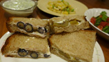 朝焼きあがるようにパンを仕込んでおいた。庭の木から毎日ブルーベリーがこれぐらい収穫される。(左側写真)サラダやヨーグルトのトッピングになることが多い。 朝ごはんは、バジルとトマトのサラダ、マカロニマウンテン(ゆでたマカロニにレモン汁とオリーブオイルからめたもの)です。 昼ごはんは、牛焼き肉アスパラガストマトチーズのサンドイッチです。(右側上段写真) ばんごはんは、キャベツ玉ねぎハムとルッコラリーフのソース焼きそば。ラッキョウトッピング。(右側上段写真) |