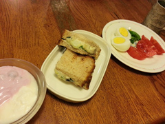 ![]() 朝ごはんは、とにかくトマトです。トマトがいっぱいあるのでとにかく消費しないと。ぬるぬるサラダ(オクラがいっぱい入ってるのでぬるぬるになった。、バナナ、ブルーベリーヨーグルトなど。 オクラのぬるぬるは水溶性食物繊維らしい。 |