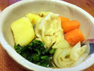 あさごはんは、白菜葱のスープ、ますずし、ほうれん草のおひたしです。 ひるごはんは、モヤシスナップエンドウのチャーハンです。 ばんごはんは、ほうれん草モヤシ長いも麦の生姜粥、チーズトマト焼き、ほうれん草、バナナヨーグルトです。 ほうれん草の葉が、寒さですごく厚くなっておいしい。 |