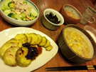 ![]() あさごはんは、にんじんキャベツのスープ、ポークソテー、肉まん、カフェオレです。(左列上下写真) 晩ご飯は、焼き芋に牛すじ佃煮を添えたん、蒸しチキンリンゴブロッコリーレタスのサラダ、昆布たいたん、スミツカレ、キャベツとキノコとコーンの生姜スープ、ヨーグルトです。 |