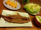 ばんごはんは、うなぎ蒲焼きごはん、豆腐えんどうオクラ味噌汁、おれんじ、レタスざっくりサラダです。