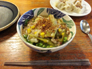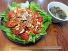 ひるごはんは、蕎麦の粥のようなスープのような、レタスざっくりマグロ唐揚げサラダ、、バーミセーキです。