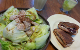 ばんごはんは、葱レバー炒め、葱ソテー、レタスのざっくりサラダ、ビールです。(左側左列下段写真)