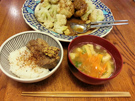 あさごはんは、メダマヤキとハム、サラダとオレンジ、トースト、カフェオレです。 ひるごはんは、サラダ2種、豚リブ角煮、味噌汁ごはん、です。 ばんごはあんな、 シーフードトマトスパゲテイです。電池切れで写真なし。 |