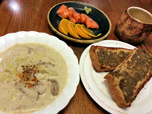 ![]() あさごはんは、サルシッチャと野菜のスープです。 ひるごはんは、焼いたさつまいもにクリームチーズを練り込みスグリシロップかけてサンドイッチにした。野菜スープとカフェオレつき。 ばんごはんは、牡蠣鍋です。(右側写真) |