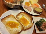 ![]() あさごはんは、ゆでたまごチキン、クリームチーズとあんこを載せたトースト、カフェオレです。 ひるごはんは、じゃがいもの炊いたん、大根の炊いたん、トマトときゅうりのサラダ、野菜スープ、たきこみごはんです。 ばんごはんは、たらこスパゲテイです。 |