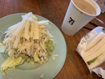 あさごはんは、コンビニサラダにチーズをたして、サンドイッチとカフェオレ。