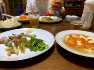 ばんごはんは、餃子、ゆで栗ブロッコリートマトゆでたまごチキンさらだ、豆腐みょうが、りんご1/4です。義父と一緒に食べた。 |