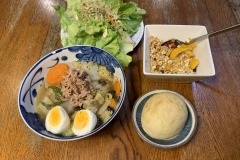 I woke up a little late. I have a slight headache and a sore throat. I forgot to turn off the air conditioner last night. Could that be the cause? I spent the morning time inhaling the steam from the hot water poured into my mug. Because, this helps relieve my headache and sore throat. I made an omelette. I had it, lettuce and tomato salad, grilled tofu and cafe au lait for my breakfast. I made and ate Chicken Ramen for my lunch around 2 pm. Around 6 pm, I made and ate a stew with vegetables, tofu, chicken and aburaage for my evening meal. |