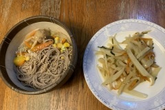 I made grilled ganmodoki, lettuce salad, cafe au lait, and Tsukimi soba. Soba noodles with raw egg are called Tsukimi soba (moon viewing soba) because the egg yolk looks like a full moon. If I really want to eat soba noodles, I make them from dried soba noodles. When I emailed my wife about it with a pictuer, she was surprised that I'm eating soba noodles in the morning. Today I spent the whole day with Miya-O entering data for accounting bills. I used to have almost no medical expenses, but last year my medical expenses exceed 100,000 yen. However more than half of that was for regular health check-ups. I made curry-flavored somen noodles with lots of vegetables, and simmered mackerel in miso paste with mixed nuts for my evening meal. |