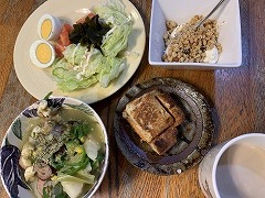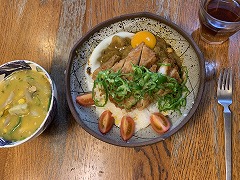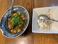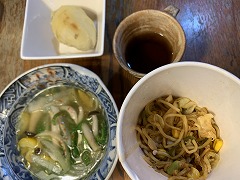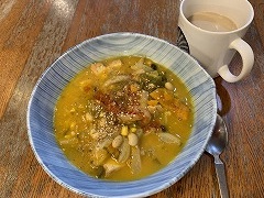 I had lettuce, boiled eggs, vegetable soup, atsuage, granola yogurt, the fish fry burger that I bought at Torisen, and cafe au lait for my breakfast. I made kakiage soba for my lunch. The soba is Togakushi soba, but it's dried. The kakiage was bought at Torisen yesterday. I remembered that there was a large ginkgo tree in front of the bell tower of Saiko-in Temple. The ginkgo tree and the bell tower would be photogenic. I went to see it. Most of the ginkgo leaves had fallen.Next year, I'll try to find a good timing. My wife was coming back from Ueda, so I went to Shimizu Park Station to pick her up. After that, we went to Coppun Cafe in Moriya and had Thai curry. |