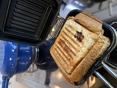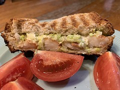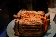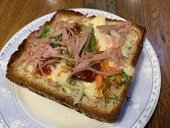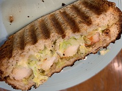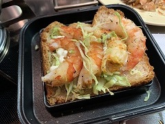 It is thinly sliced pork belly and mixed together with grated potatoes, then I grilled it. I called it Butabara burger. I made a hot sandwich with grilled shrimp, cabbage and mayonnaise on toast. |