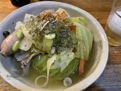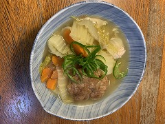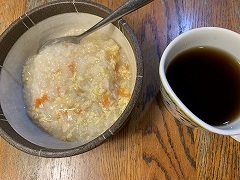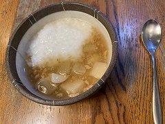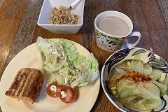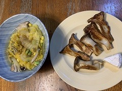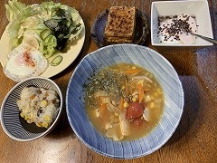 It was raining. I went to take a photo of the nearby Kannon stone statue. The image I got was different from what I would have gotten on a sunny day. I made tomato vegetable soup for my breakfast. Adding tomatoes changes the soup from vegetable soup to tomato soup. The taste changes dramatically. I also had a fried egg, lettuce, wakame seaweed, and cucumber salad, grilled atsuage, and cacao nib yogurt, and cafe au lait. I went to Costco and bought potatoes, onions, green peppers, eringi mushrooms, shimeji mushrooms, dried shiitake mushrooms, sausages, and Greek yogurt. I had temseiro soba at my favorite soba restaurant Kimura for my lunch. I had two kinds of mushroom and vegetable soup and two kinds of grilled mushrooms for my evening meal. |